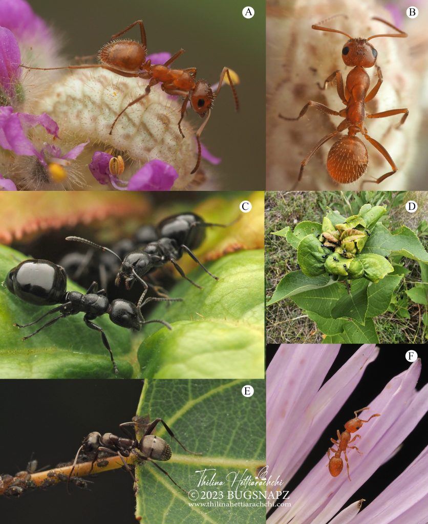 Figure 10. A & B. Bradley’s field ant, Formica bradleyi attending to a lycaenid caterpillar feeding on the petals of Dalea villosa. C & D. Taschenberg’s odorous ants (Dolichoderus taschenbergi) spotted on a Prunus plant. E. Formica sp. ant attending to aphids on an aspen leaf. F. A tiny doubtful acorn ant (Temnothorax ambiguus) observed on Erigeron flower petals.