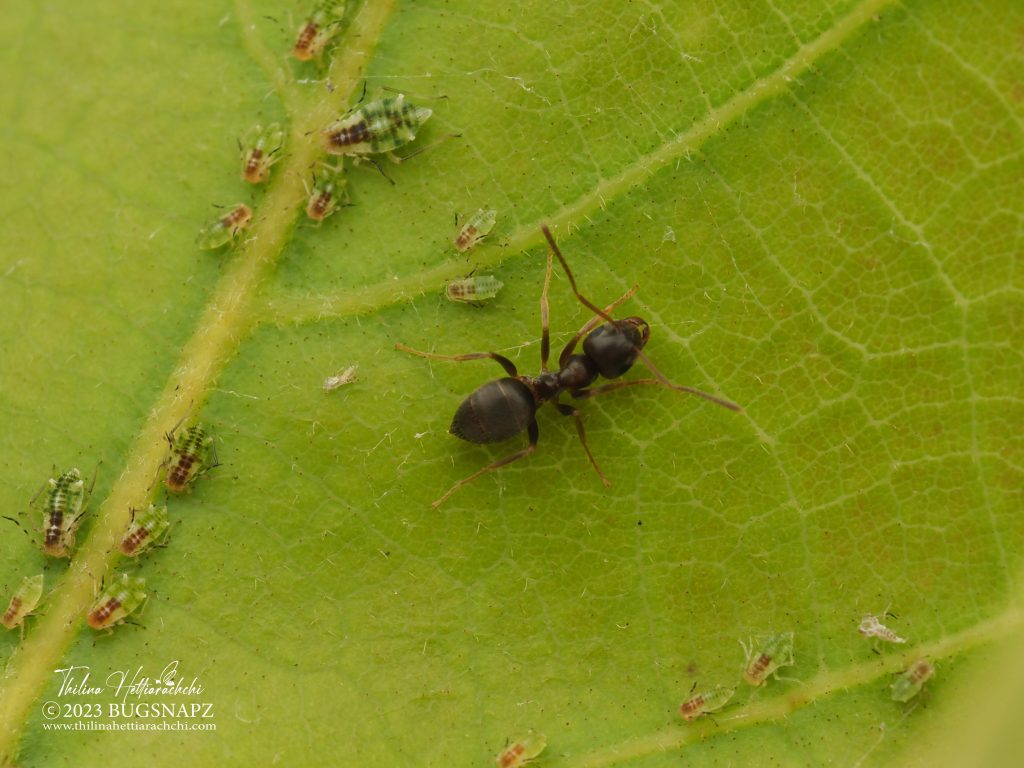 Figure 11. A busy ant, Lasius sp. tends to aphids on a Salix leaf.