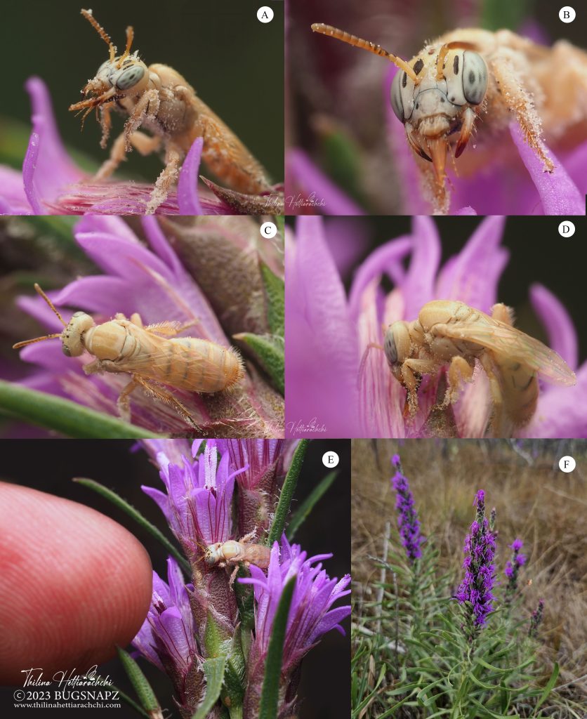 Figure 3. Female Perdita perpallida spotted on dotted gayfeather flowers (Liatris punctata). A. Engaged in cleaning the head region. Females often store pollen on the underside of the thorax before transferring it to the scopa on the hind tibia. B. Close-up of the head. C. Dorsal habitus. D. Captured while drinking nectar from the flower. E. Size comparison of the bee with my index finger. F. Inflorescences of Liatris punctata.