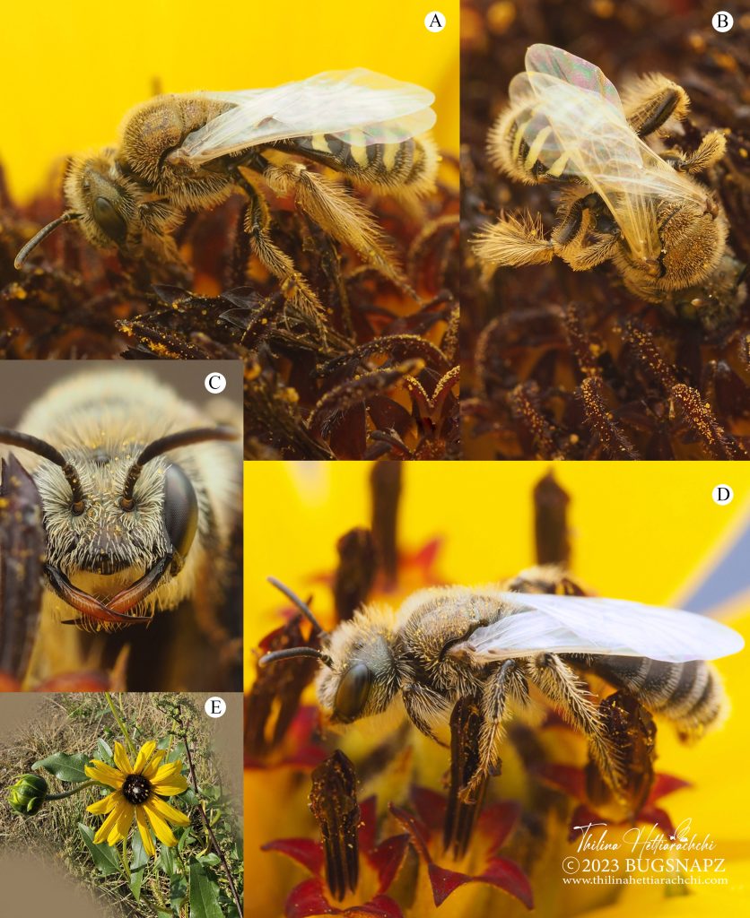 Figure 4. Perdita albipennis bees on prairie sunflowers, Helianthus petiolaris. A. Dorsolateral habitus of a female. B. Dorsal view of a female. C. Close-up of the head of a male. D. Dorsolateral habitus of a male. E. Prairie sunflower, Helianthus petiolaris.