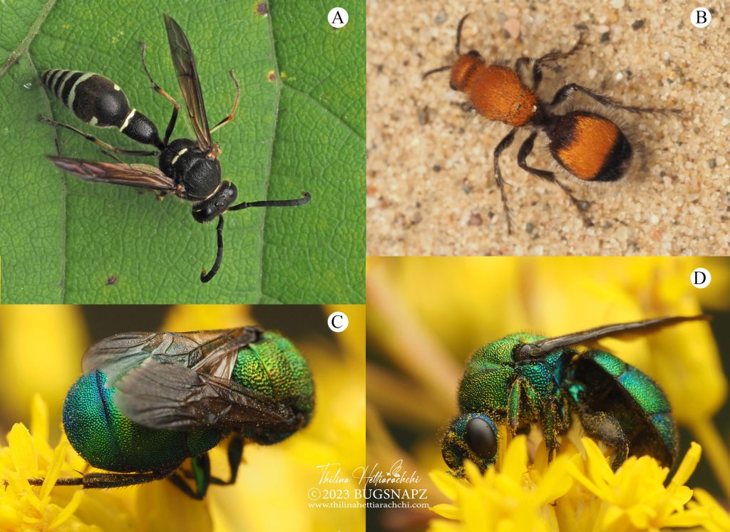 Figure 7. A. Cross potter wasp (Eumenes crucifera) resting on a leaf. B. A female velvet ant, Dasymutilla bioculata. C & D. A cuckoo wasp, Hedychrum sp. photographed while sipping nectar from Solidago rigida flowers.
