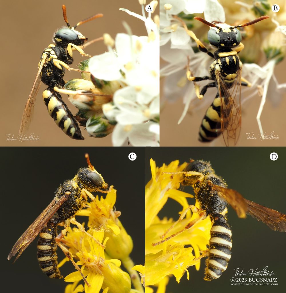 Figure 8. A & B. A busy beewolf, Philanthus cf. pysche. on white prairie clover, Dalea candida. C & D. Another beewolf species (Philanthus ventilabris Fabricius, 1798) on Solidago rigida flowers.