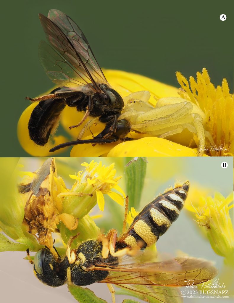 Figure 9. A. A goldenrod crab spider, Misumena vatia, with its freshly caught prey—a male Lasioglossum (Dialictus) nigroviride bee, perched on a flower of fairy false goldenaster, Heterotheca villosa. B. A jagged ambush bug, Phymata americana, feeding on a beewolf (Philanthus ventilabris) on Solidago flowers.